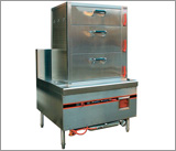 (2) 蒸柜爐由上身柜體及下身黑鐵爐膽組成,爐身面板厚1.5 mm,爐殼體厚1.0mm,內(nèi)膽厚0.8mm。上身分三格,每一格設(shè)有獨(dú)立蒸氣過(guò)壓釋放開(kāi)關(guān);上面兩格每格內(nèi)含不銹鋼層網(wǎng)一件,第三格內(nèi)含不銹鋼層網(wǎng)兩件。每格上有不銹鋼掩門(mén),門(mén)框上采用優(yōu)質(zhì)衛(wèi)生無(wú)毒、耐高溫硅膠條密封,防止蒸氣泄漏。在爐身上設(shè)有安全瀉氣閥,自動(dòng)排出過(guò)壓蒸氣。